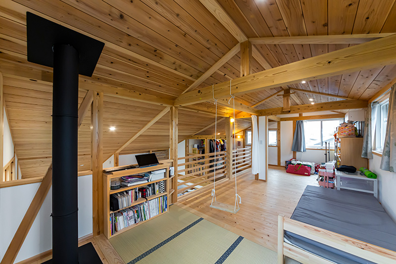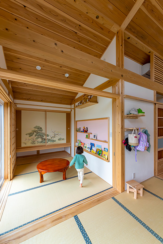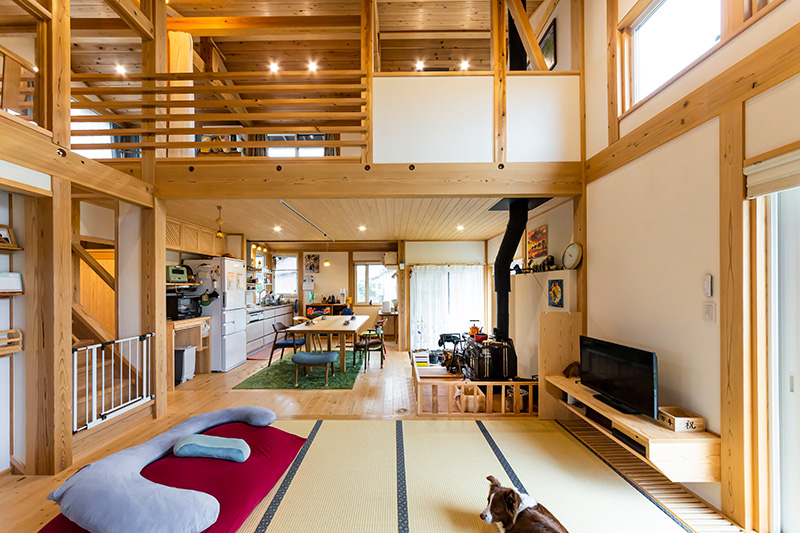 吹き抜けのある開放的な設計は、光や風がめぐる清々しい暮らしを演出し、伝統的な畳スペースや無垢材の床が安心感と柔らかさを添えています。