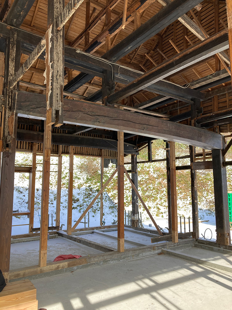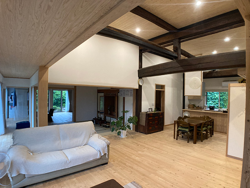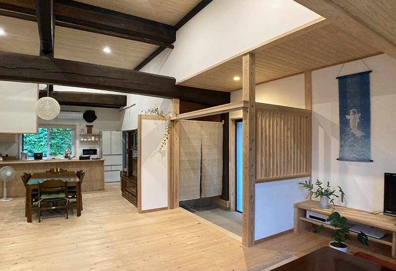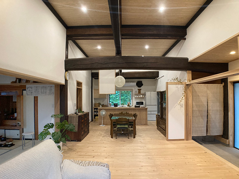 長く家族の歴史を刻んできた住まいの柱や梁に刻まれた痕跡には、世代を超えて受け継がれてきた家族の記憶が宿っています。この住まいは、その面影を大切に残しながら、次の時代にふさわしい快適性を整えたリノベーションの実例。外観は旧家の面影を残しつつすっきりとした落ち着きある佇まいに。内部は伝統的な空間構成を残しつつ、光と風を取り入れる設計としました。古梁や無垢材の床、趣ある建具が古き良き日本の家を想起させる一方で、キッチンや水回りは現代の暮らしに合わせた機能性を備えています。懐かしさと新しさが自然に溶け合い、親から子へ、子から孫へと、住まいの記憶をつないでいく。そんな「未来に紡ぐ家」のかたちが、この住まいに表れています。