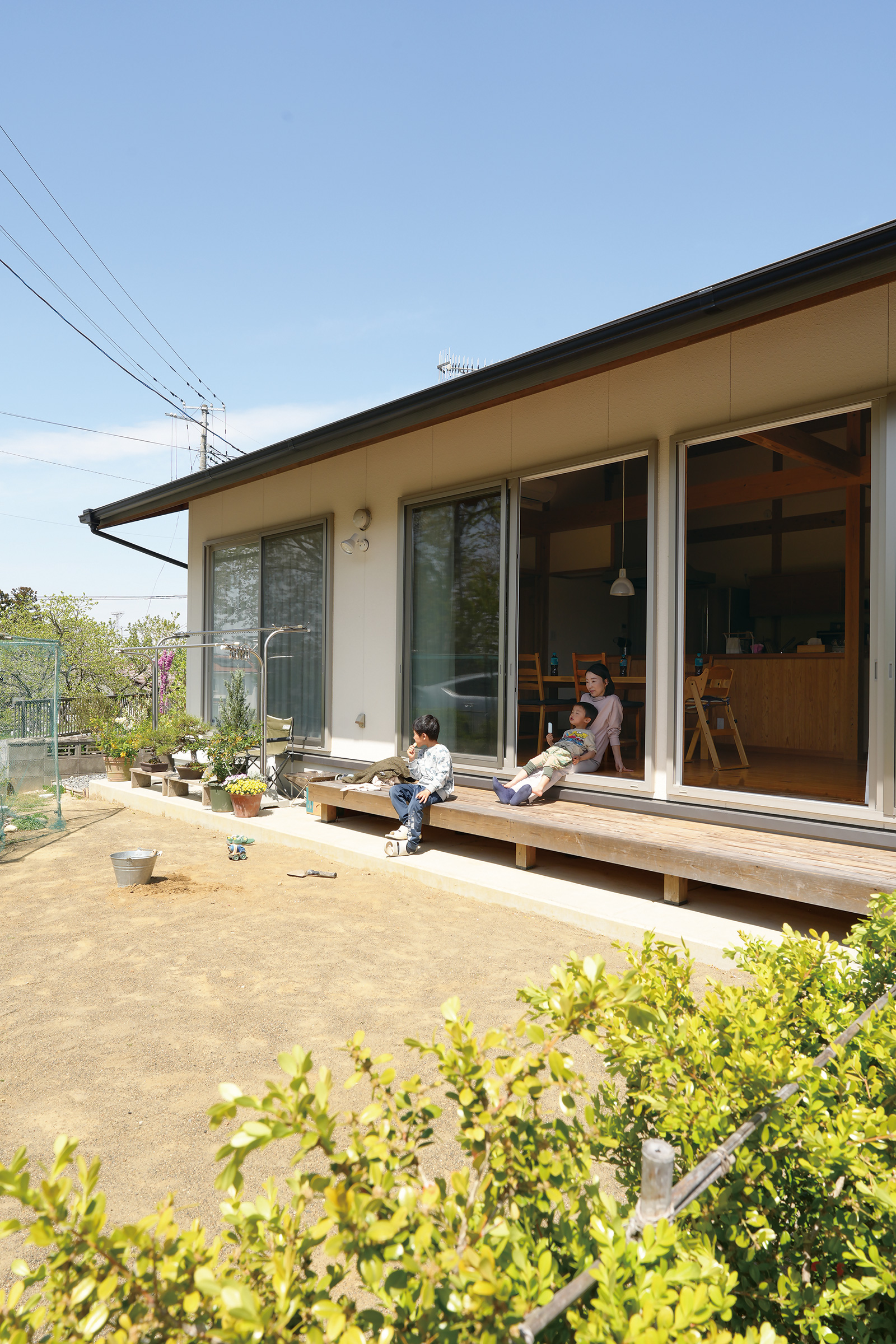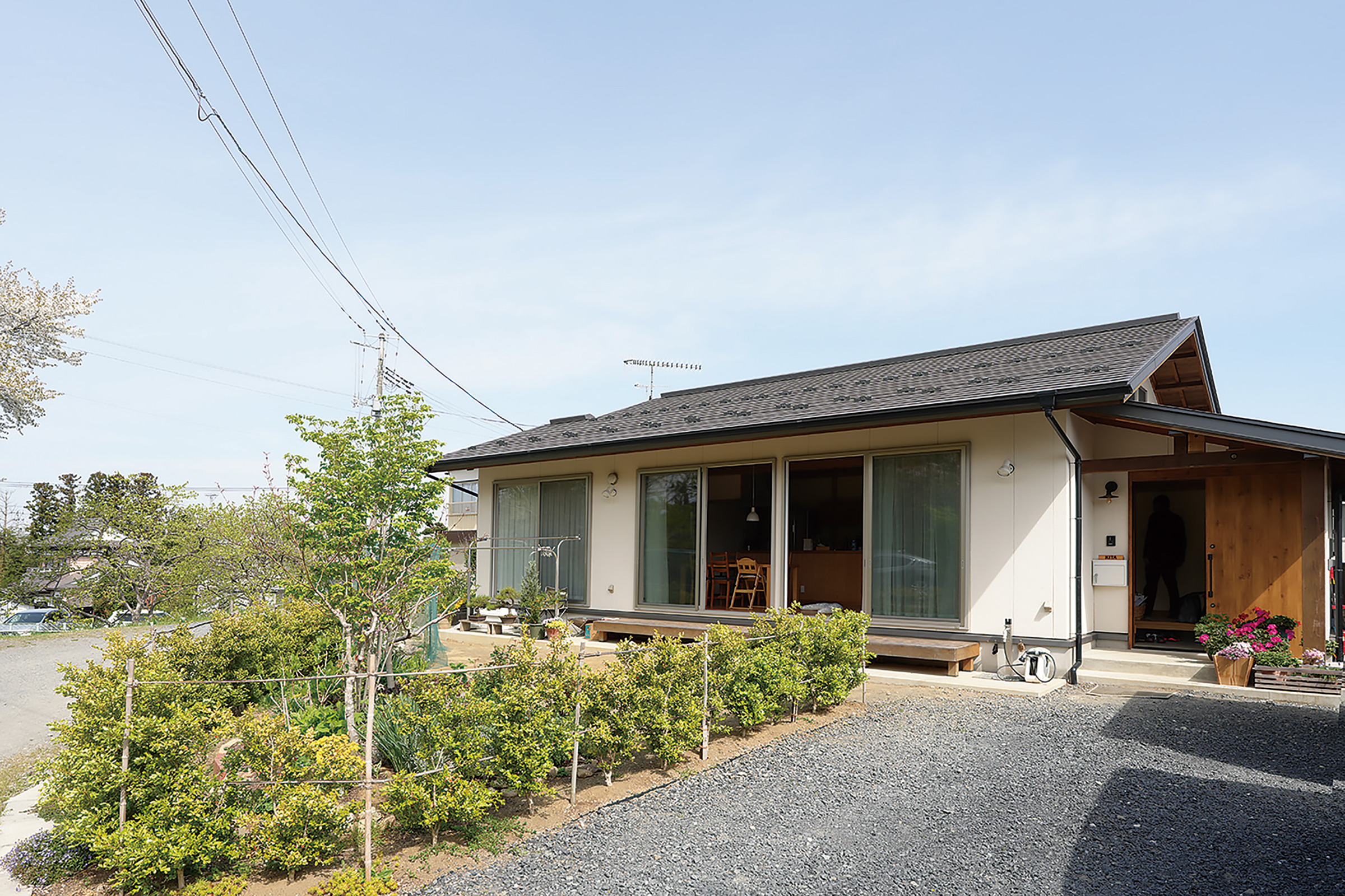 施主が望んだある程度のゆとりある土地に建つ平屋。そこには家と外をゆるやかにつなぐ暮らしが描かれています。敷地の形や方角に合わせて、家の角度や配置を丁寧に調整することで、光や風を効率よく招き入れる。