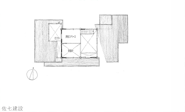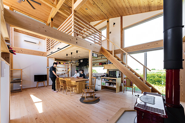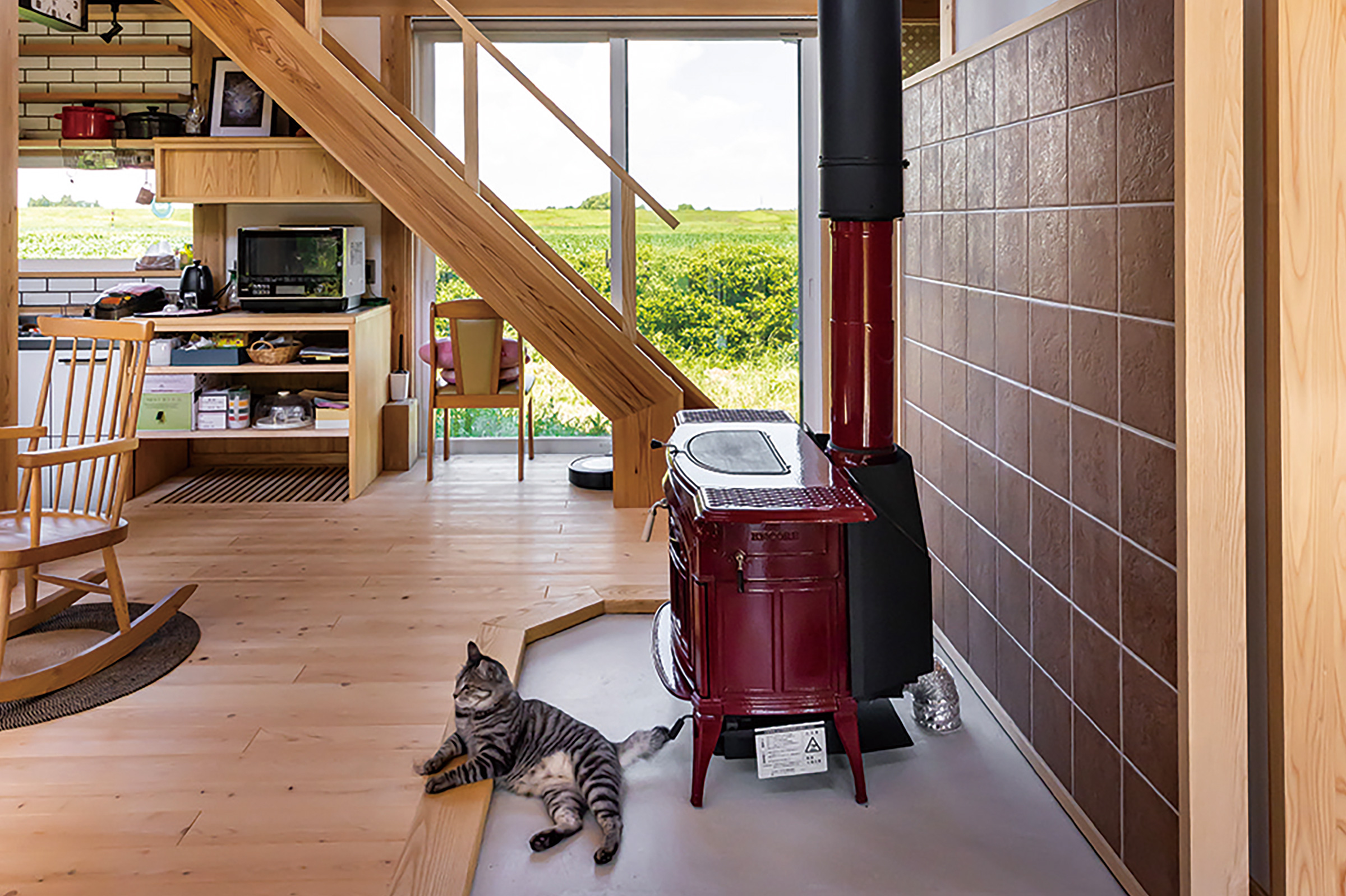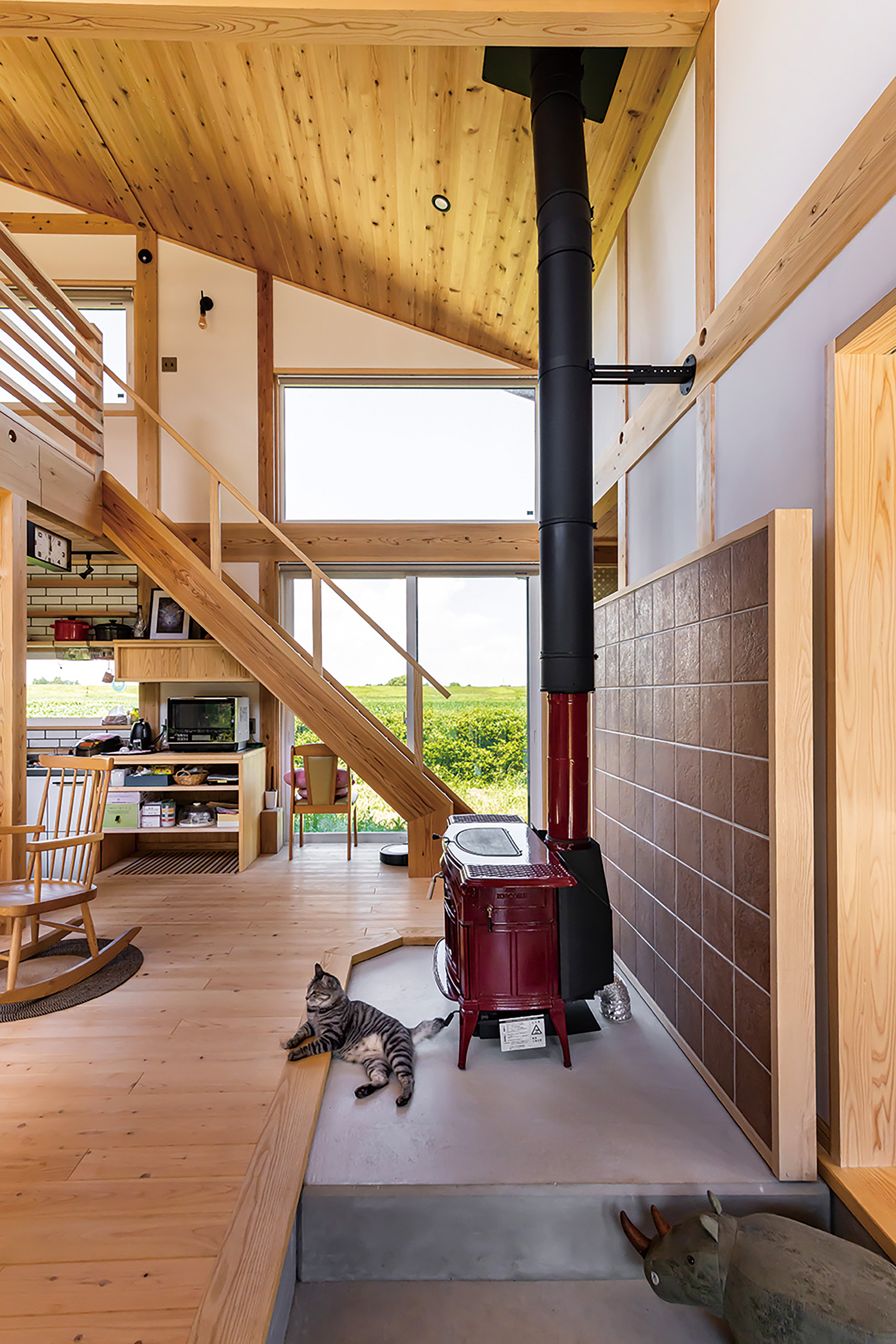 施主が望んだのは猫ファーストの家づくり。梁に沿ったキャットウォークや寝室のキャットステップ、薪ストーブの前に広がる土間。これらは猫と人が同じ空間を自由に行き来できるよう、最初の設計段階から組み込まれています。遊び心と実用性を両立したプランニングが、日々の生活を楽しく、心地よく彩ります。