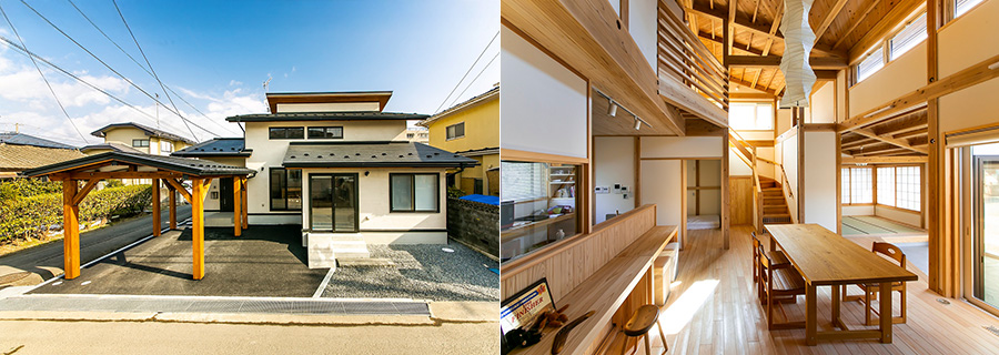 高天井が気持ち良いリビングと和室の間に、趣味作業ができる土間を配したお住い。