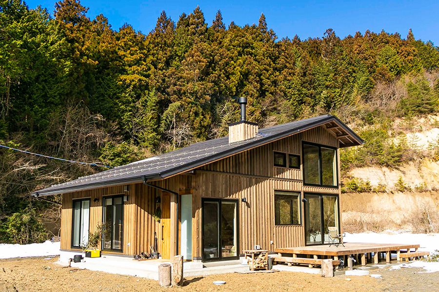 印象的で穏やかな表情を見せる木壁の外観、開放感を生む吹き抜けと大開口、重厚感あふれるこだわりの薪ストーブ、リモートワークに対応したプランニング等々、楽しくて個性的な仕様や演出を存分に取り入れたお住まい。開かれた土地ならでは、自然の移り変わりを楽しみ、自然の恵みを活用するプランニングも見どころです。