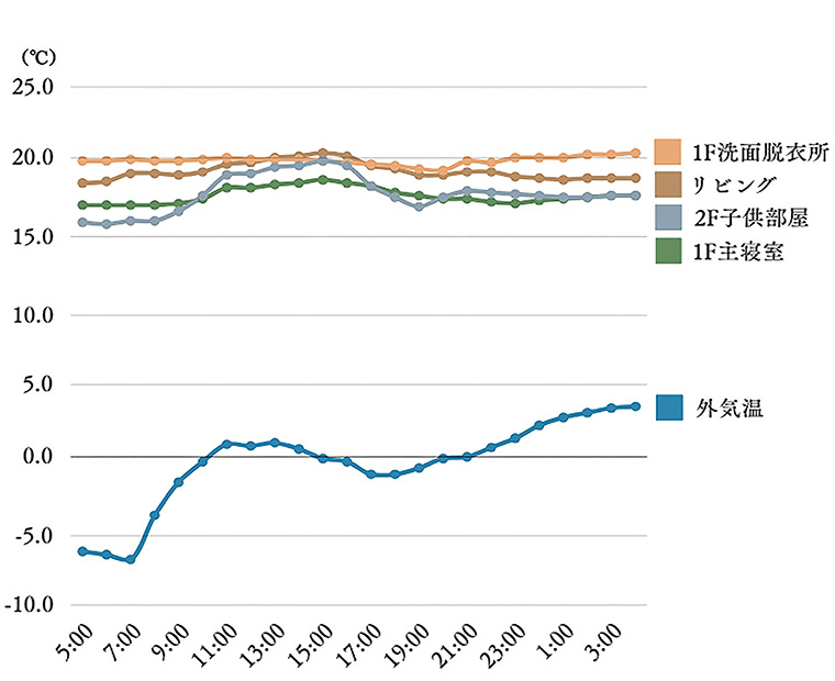 ※ 冬の室内気温と外気温については2024年1月16日~17日に施主さま宅で1時間ごとに記録(エアコンを常時19℃に設定)。