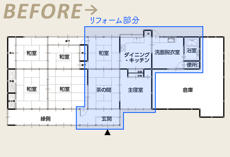 延床面積:250.65m2(75.82坪)、改修面積:98.5m2(29.80坪)