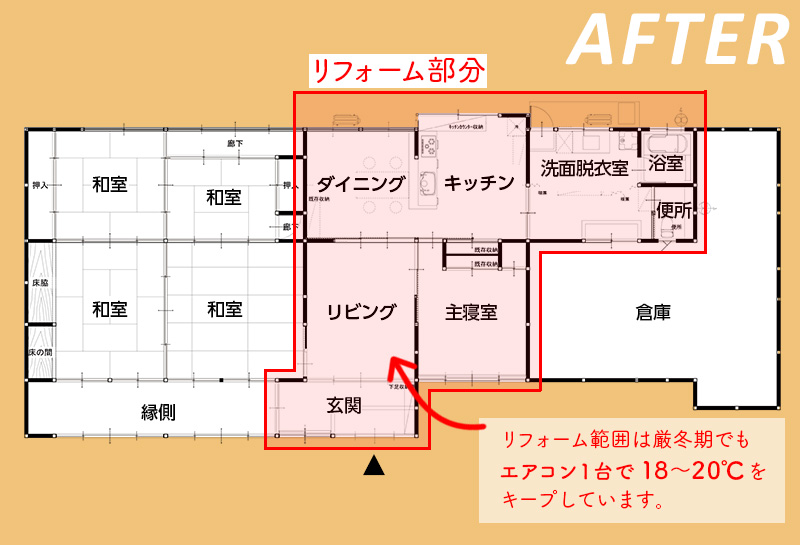 昔ながらの大きな住まい等を対象に、日常生活で使用する部分を中心に断熱改修を行う中規模リノベ。OT邸では断熱改修に加え、キッチン、風呂、サニタリー、トイレなどの水廻り設備の入れ替えも行いました。希望の予算とライフスタイルのバランスを丁寧に擦り合わせをしながら、厳しい冬季間の暮らしやすさを改善し、四季を通して快適に過ごすことを重視したリノベーション提案です。