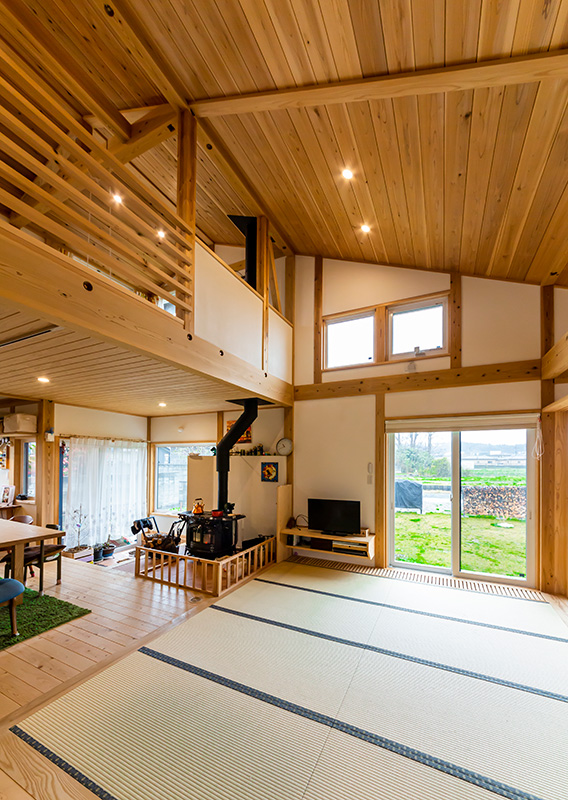 吹き抜けのある開放的な設計は、光や風がめぐる清々しい暮らしを演出し、伝統的な畳スペースや無垢材の床が安心感と柔らかさを添えています。