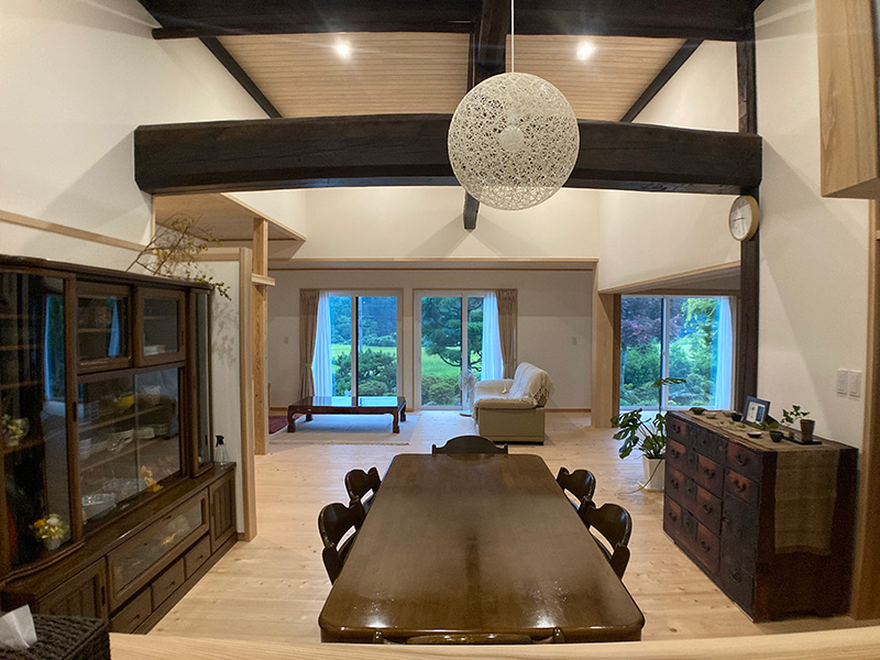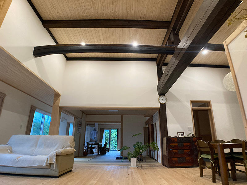 長く家族の歴史を刻んできた住まいの柱や梁に刻まれた痕跡には、世代を超えて受け継がれてきた家族の記憶が宿っています。この住まいは、その面影を大切に残しながら、次の時代にふさわしい快適性を整えたリノベーションの実例。外観は旧家の面影を残しつつすっきりとした落ち着きある佇まいに。内部は伝統的な空間構成を残しつつ、光と風を取り入れる設計としました。古梁や無垢材の床、趣ある建具が古き良き日本の家を想起させる一方で、キッチンや水回りは現代の暮らしに合わせた機能性を備えています。懐かしさと新しさが自然に溶け合い、親から子へ、子から孫へと、住まいの記憶をつないでいく。そんな「未来に紡ぐ家」のかたちが、この住まいに表れています。