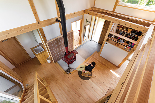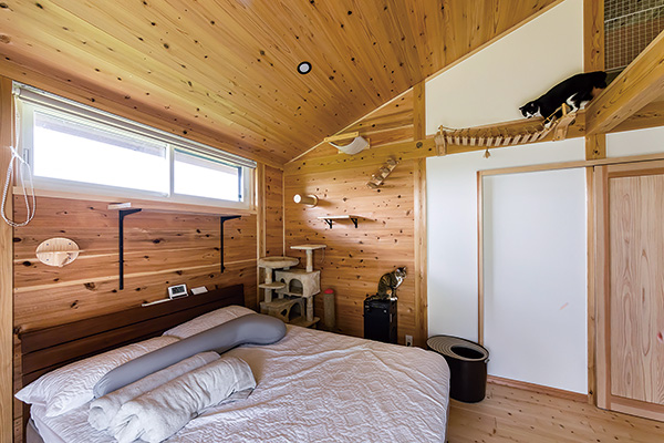 施主が望んだのは猫ファーストの家づくり。梁に沿ったキャットウォークや寝室のキャットステップ、薪ストーブの前に広がる土間。これらは猫と人が同じ空間を自由に行き来できるよう、最初の設計段階から組み込まれています。遊び心と実用性を両立したプランニングが、日々の生活を楽しく、心地よく彩ります。