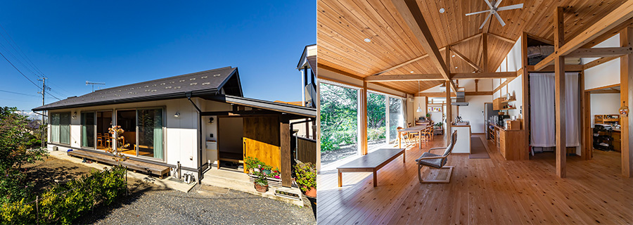 高天井が気持ち良いリビングと和室の間に、趣味作業ができる土間を配したお住い。