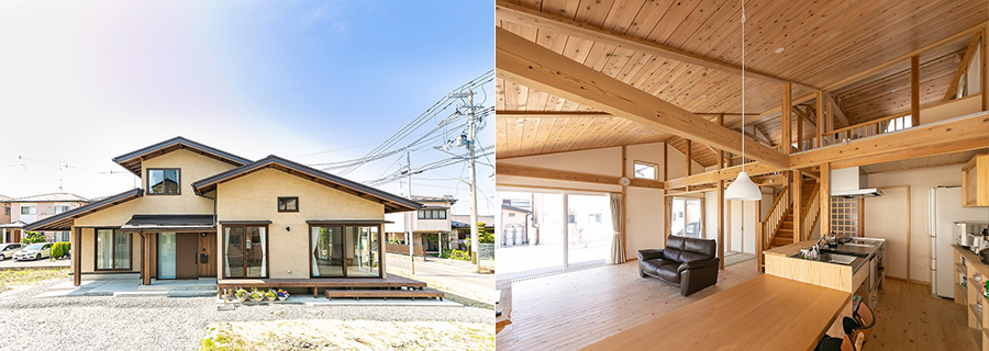 広さや自由度のある敷地に、お子さんを育む庭、大屋根の吹抜けが広がるLDKの伸びやかな団欒空間のお住まいになります。