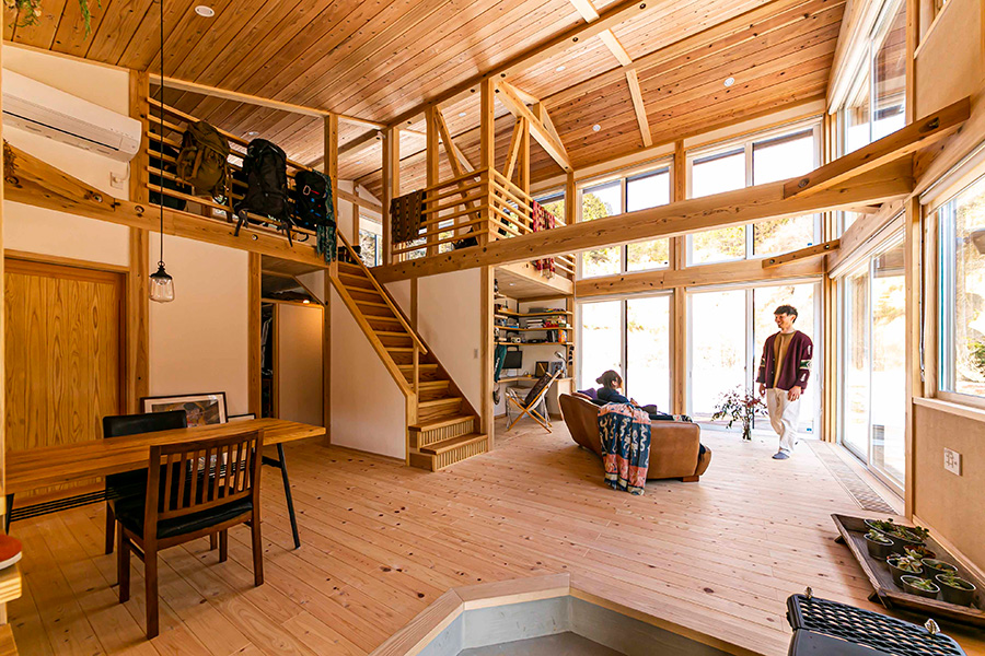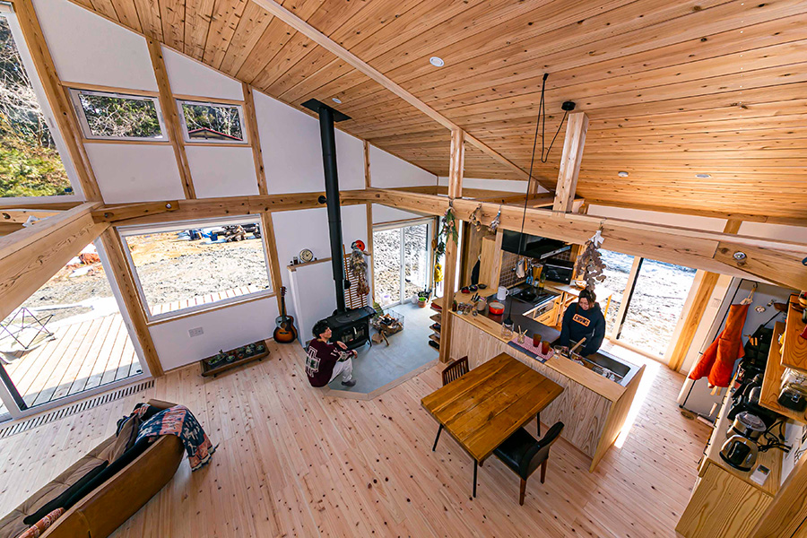 印象的で穏やかな表情を見せる木壁の外観、開放感を生む吹き抜けと大開口、重厚感あふれるこだわりの薪ストーブ、リモートワークに対応したプランニング等々、楽しくて個性的な仕様や演出を存分に取り入れたお住まい。開かれた土地ならでは、自然の移り変わりを楽しみ、自然の恵みを活用するプランニングも見どころです。
