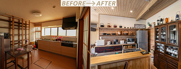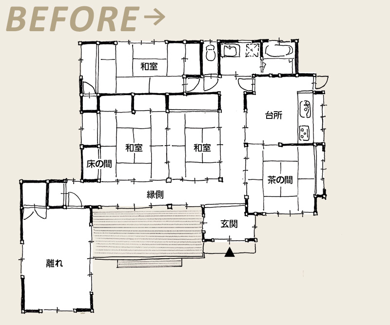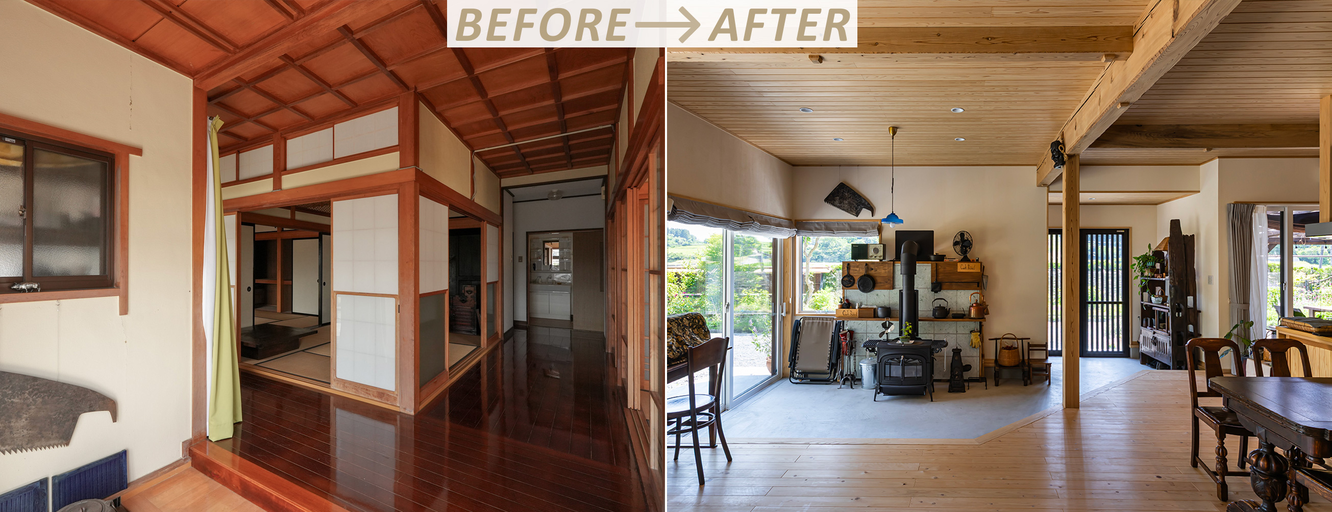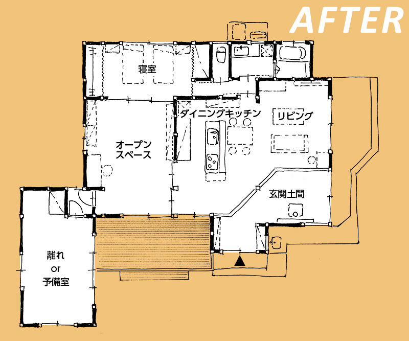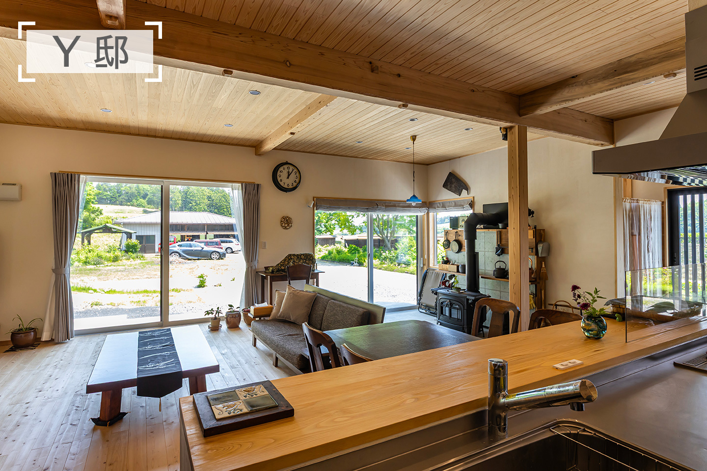 旧家は玄関から北に向けて廊下が通り、右(東)側にリビングとキッチン、左側に続き間が3 部屋が連なる、大人数が集まることを前提にした昔ながらの間取り。新しい住まいは玄関に薪ストーブが置ける土間を広く置き、綿密な構造計算の上、柱を省いて大空間を創出しました。